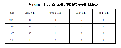 2025年国际商务专业硕士学位点共招生16人,其中留学生1人;在读情况为2023级15人,2024级人15人;尚未有应届生毕业、学位授予及就业基本状况(见表1)。