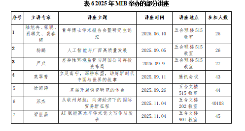 科研团队与企业、高校等实际应用领域保持良好的合作关系,教师积极开展产学研合作,深入了解实际问题和需求,将研究成果应用到实践中,地方社会经济发展提供了智力支撑。举办了“数智技术赋能经济高质量发展”学术研讨会、“人工智能与边疆治理”学术研讨会,以及举办了以“新质生产力与边疆民族地区高质量发展”为主题研究生论坛,与龙州县委宣传部共建研究生联合培养基地,为同学们提供实习实践平台。与广西大学、广西民族大学等进一步加强国际商务硕士研究生培养合作的合作,共享兄弟院校优质的师资。邀请广西大学工商管理学院南开大学博士生导师严兵教授等学者专家到校为同学们开展讲座,增长了知识,开拓了视野(见表6)。
