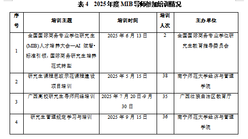 1.加强师资培训。国际商务教师积极参加全国国际商务专业学位研究生教育指导委员会等各级各类师资专项交流研讨活动,包括参加全国国际商务专业学位研究生创新创业精英挑战赛、院长工作会议、教学管理工作会、全国国际商务硕士学位论文分类与写作研讨会等。学院每学期定期组织本校教师开展教学研讨交流活动,如:研究生课程思政示范课程建设、广西高校研究生导师网络培训、研究生管理规定学习与培训等等(见表4)。