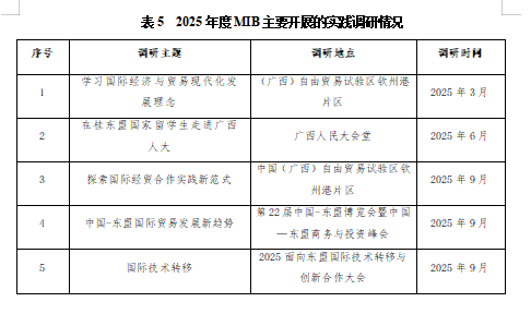 2.积极开展实践教学。积极利用教育部中国专业学位案例中心教学案例库,共享全国优质的教育资源。本年度组织学生到广西自贸区钦州港片区、中国—东盟博览会、2025面向东盟国际技术转移与创新合作大会等地等地开展实践(见表5)。