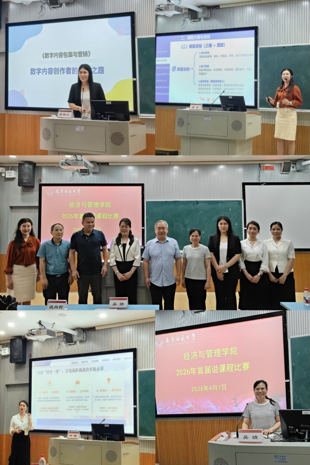比赛现场氛围热烈且严谨,五位参赛教师依次登台,围绕各自主讲课程,从课程理念、设计思路、教学实施、特色创新等方面展开精彩展示。肖琳文老师以《数字内容包装与营销》为题,聚焦数字内容创作领域,分享课程“养生之路”的教学构建,紧扣行业发展趋势,打造贴合市场需求的教学内容;程潇凝老师对《社会学概论》课程进行系统阐述,立足学科基础,明晰课程育人逻辑与教学实施路径;裴春梅老师围绕《国际投资》课程,重点展示数智化课程改革成果,将数字化技术与专业教学深度融合,创新教学模式;叶颖老师以“虚实融通,数智赋能,德能并修”为核心,详解《国际贸易模拟操作》课程的实践教学体系,兼顾专业技能培养与德育渗透;闭闲老师针对《管理沟通》课程,结合学科特点与学生能力培养需求,梳理课程教学重点与实施策略,突出实用性与互动性。